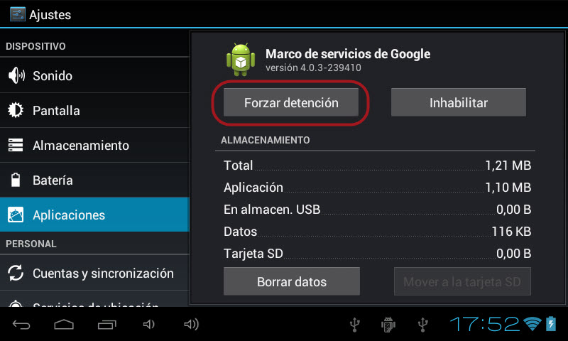 4) En la siguiente pantalla se nos muestran varios botones, se debe pulsar la que contiene la opción “Forzar detención”.