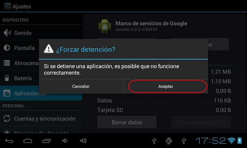 5) Por seguridad el sistema nos preguntará si realmente deseamos forzar la detención de la aplicación informándonos que si lo hacemos podría la aplicación no funcionar correctamente, como precisamente queremos detenerla porque no está funcionando correctamente elegimos “Aceptar”.