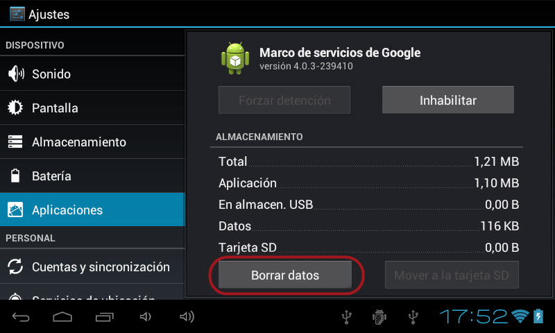 6) Ahora la aplicación ya está detenida. En este punto pulsamos la opción “Borrar datos”.
