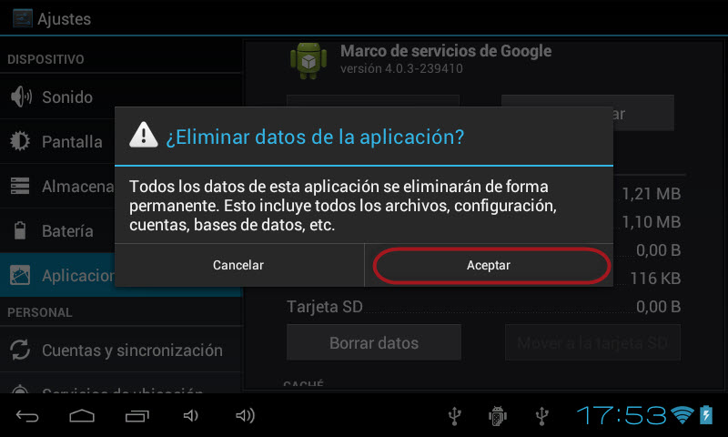 7) Nuevamente por seguridad se nos pregunta si queremos hacerlo, y , nuevamente elegimos “Aceptar” para borrar esos benditos datos que están haciendo que no podamos descargar nada de la Play Store.